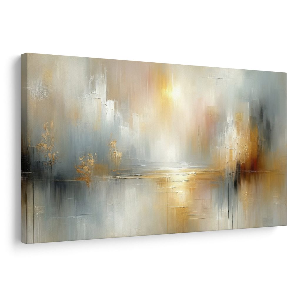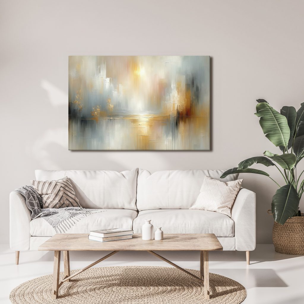Dieses Wandbild mit goldenem Licht über dem See fängt die Harmonie der Natur und Ruhe ein. Im Vordergrund erscheinen zarte Silhouetten von Bäumen, während sich warme goldene und silberne Farbtöne auf der Wasseroberfläche spiegeln. Die Atmosphäre ist angenehm und beruhigend, ideal für Entspannung und Meditation. Dieses Stück ergänzt sowohl moderne als auch klassische Interieurs perfekt und bringt einen Hauch von Eleganz in Ihr Zuhause. Das Wandbild ist aus hochwertigen Materialien gefertigt, was seine Langlebigkeit und dauerhafte Schönheit gewährleistet.