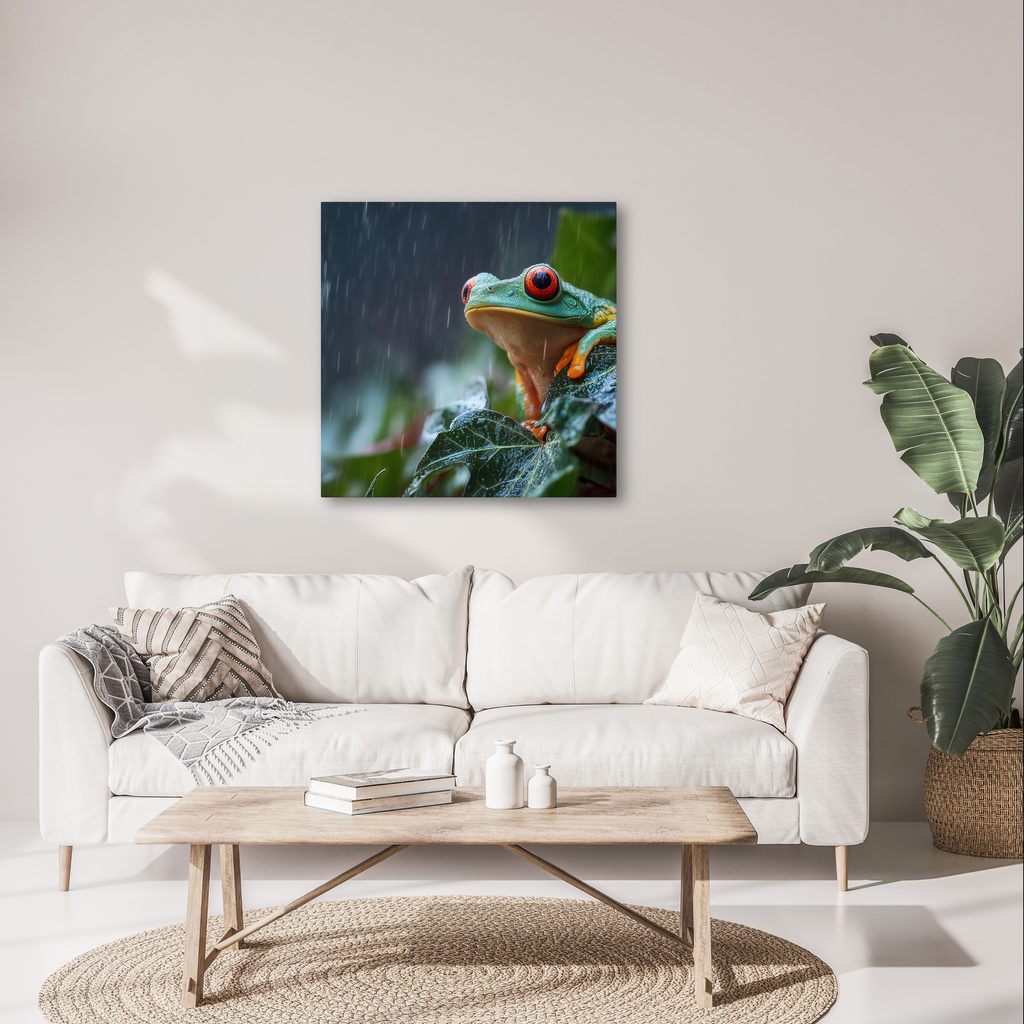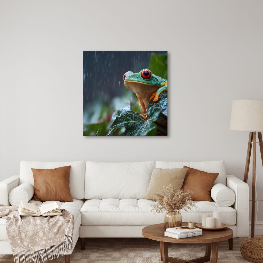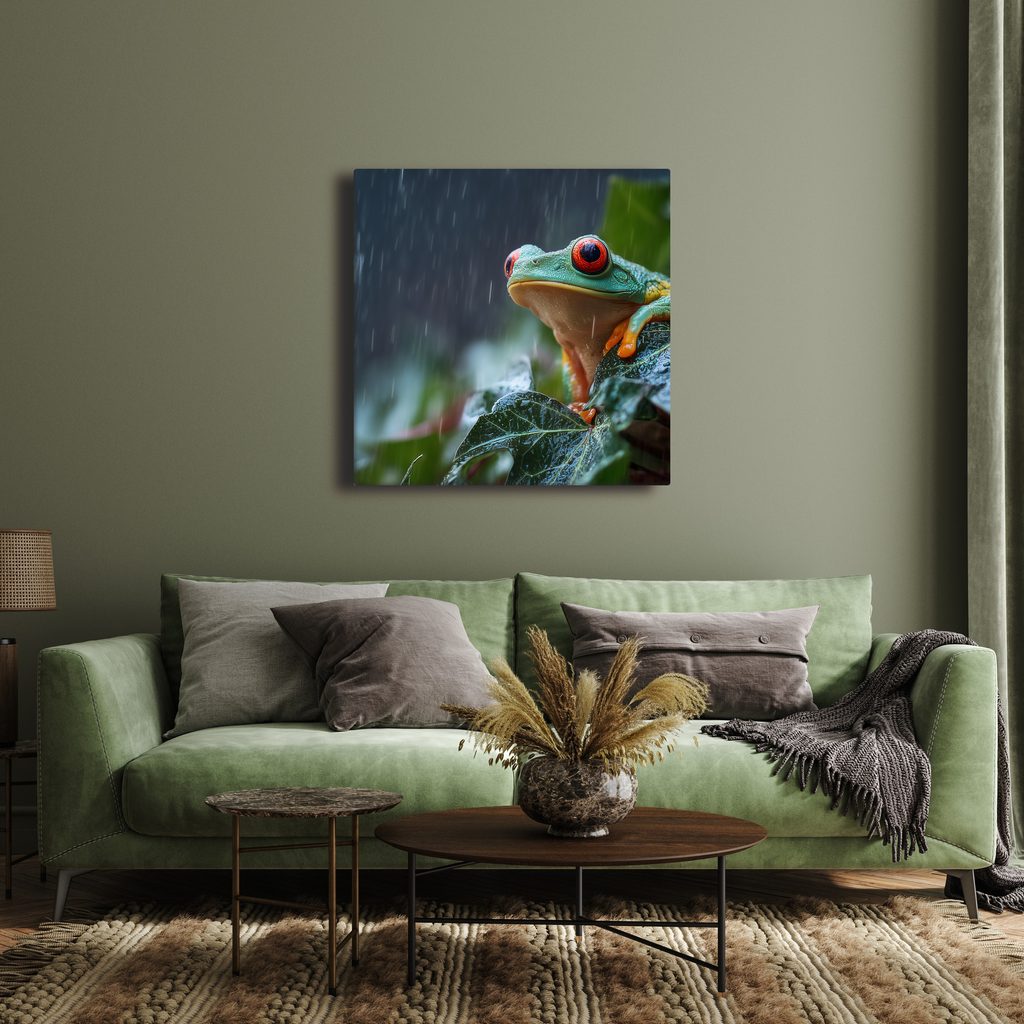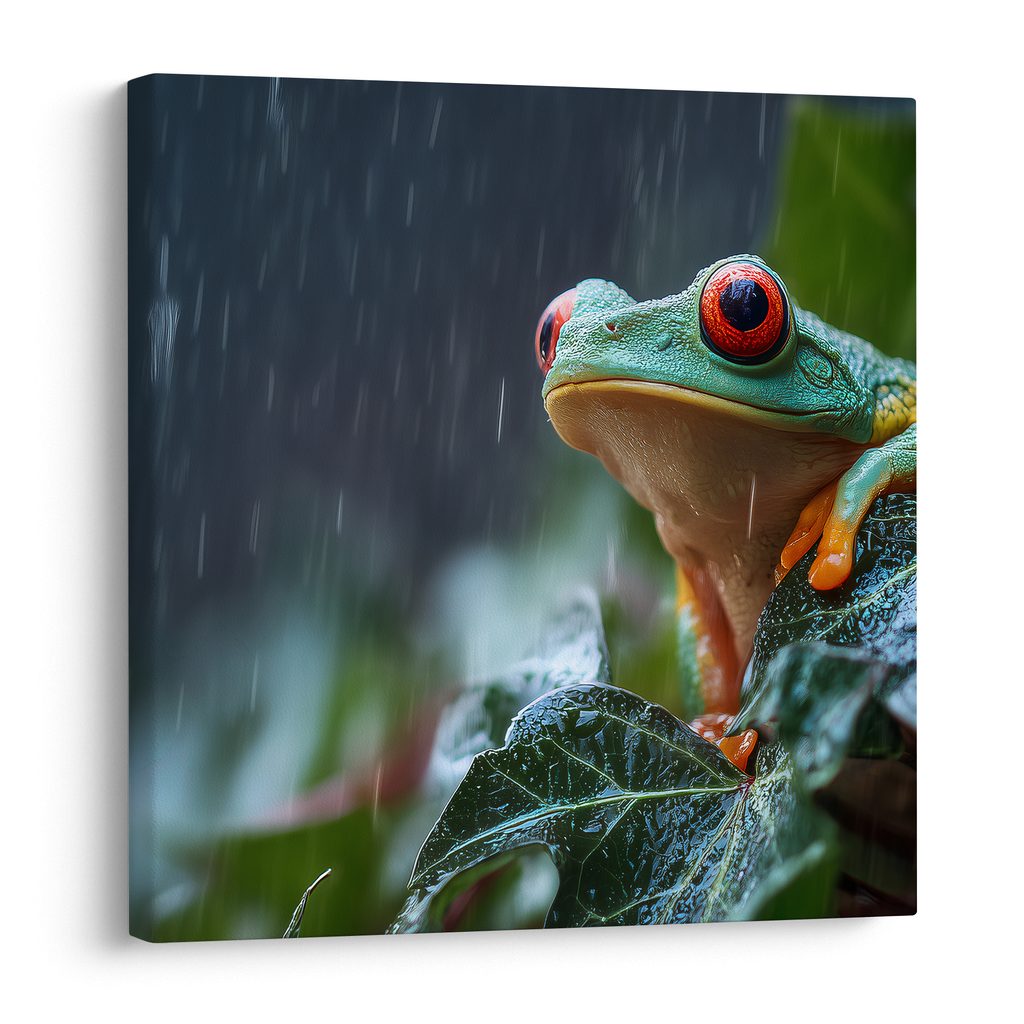 Wandbild regentropfen auf einem froschblatt