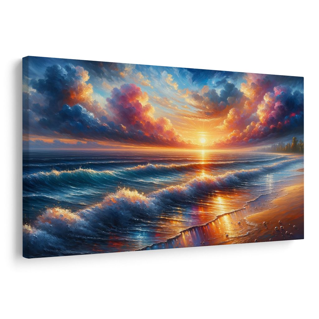 Das Wandbild fängt einen wunderschönen Sonnenuntergang über dem Meer ein, bei dem die Sonnenstrahlen sich auf der ruhigen Wasseroberfläche spiegeln. Die Details der Wellen und die dramatischen Wolken verleihen der Szene Dynamik und Tiefe. Warme Töne von Orange, Rosa und Blau schaffen eine angenehme und ruhige Atmosphäre. Dieses Wandbild eignet sich hervorragend für das Wohnzimmer oder das Schlafzimmer, wo es ein Gefühl von Ruhe und Harmonie vermittelt. Die Druckqualität und das Material garantieren Langlebigkeit und Farbintensität, was es zur idealen Dekoration für jedes Interieur macht.