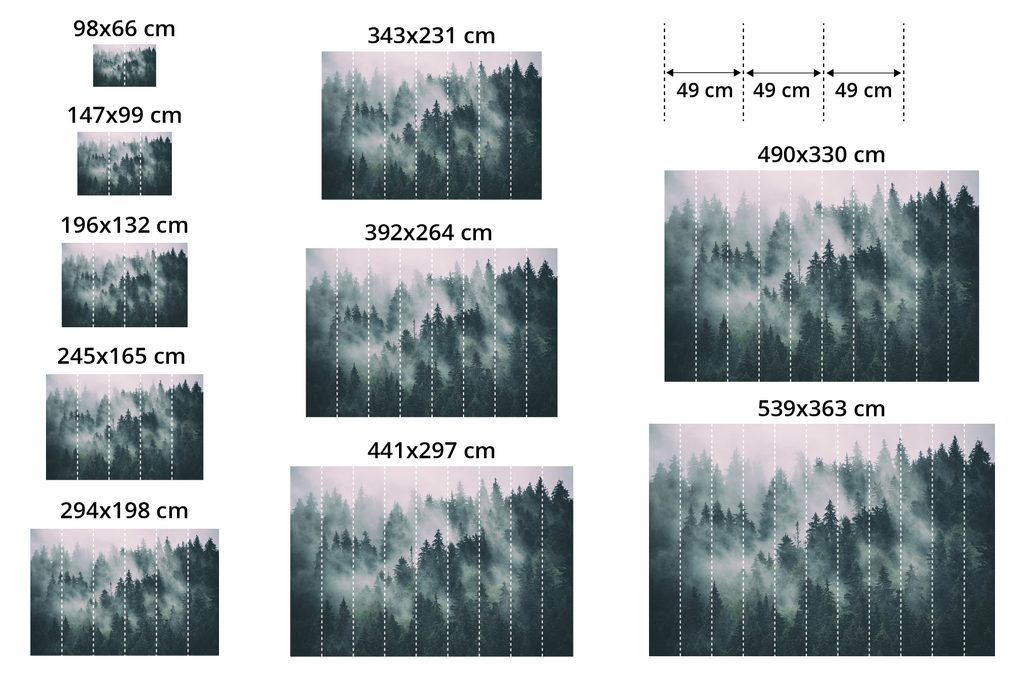 Bei Tapeten mit einer Höhe von 270 cm wird das Motiv an die jeweilige Größe angepasst, wodurch Teile des Motivs entfallen können. Nach dem Anklicken der gewünschten Größe auf der Website wird die exakte Darstellung der Tapete angezeigt. Die Größen bestehen aus 49 cm breiten Bahnen.